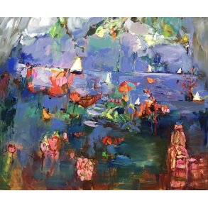 "By og Hav" maleri af Tina Asmussen 100x120cm